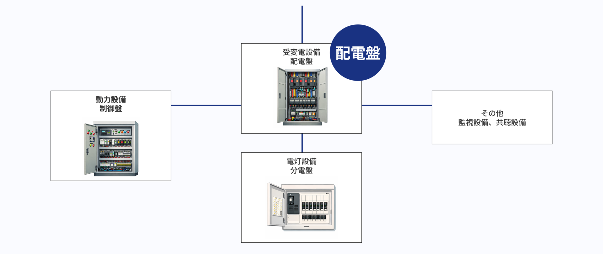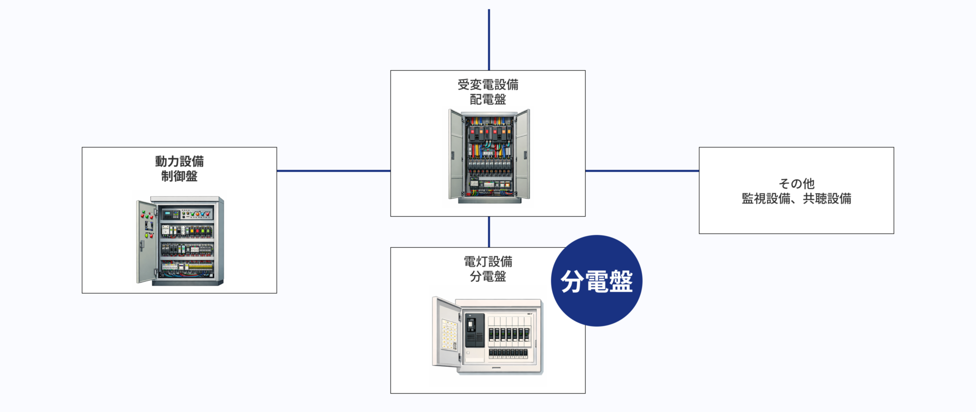 この箱は分電盤と呼ばれており、配電盤の下流(二次側)に設置されます。この分電盤は、使用電力を規定値以下に抑え、漏電や短絡による事故を防ぐ共に、配電盤から供給される電気をそれぞれの回路に適切に振り分けています。制御盤にもこの分電盤の機能が内蔵されています。