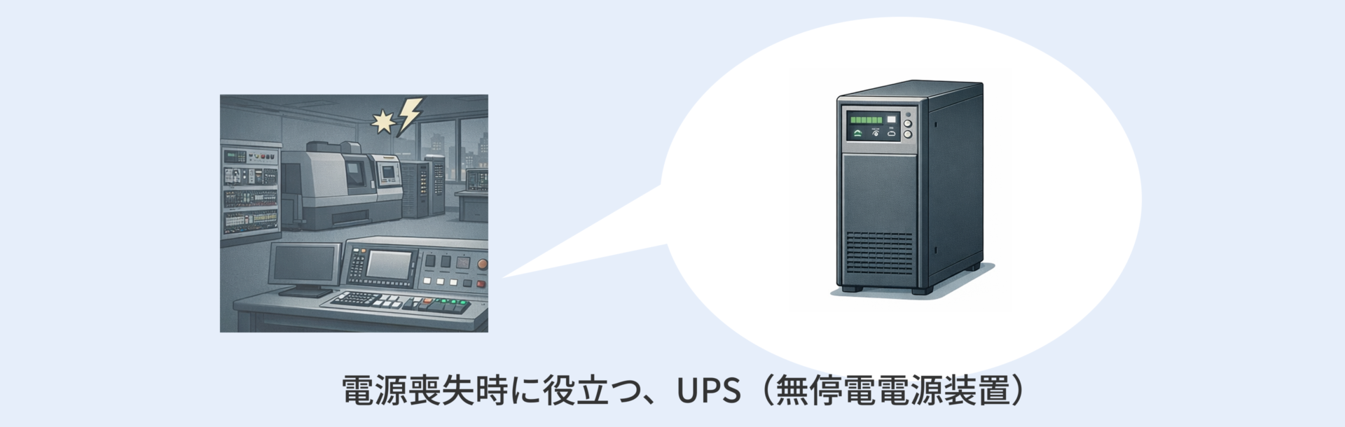 UPS(無停電電源装置)とは、バッテリーとインバーターなどを組み合わせたもので、停電などで電源を喪失した場合でも、電源が切れることなく一定時間電気を供給し続けることができる装置のことです。